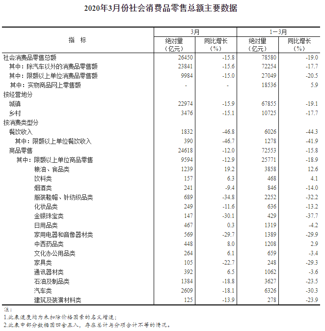 消費(fèi)方面,3月份,社會消費(fèi)品零售總額26450億元,同比下降15.8%(扣除價(jià)格因素實(shí)際下降18.1%,以下除特殊說明外均為名義增長),降幅比1-2月份收窄4.7個(gè)百分點(diǎn)。其中,除汽車以外的消費(fèi)品零售額23841億元,下降15.6%。