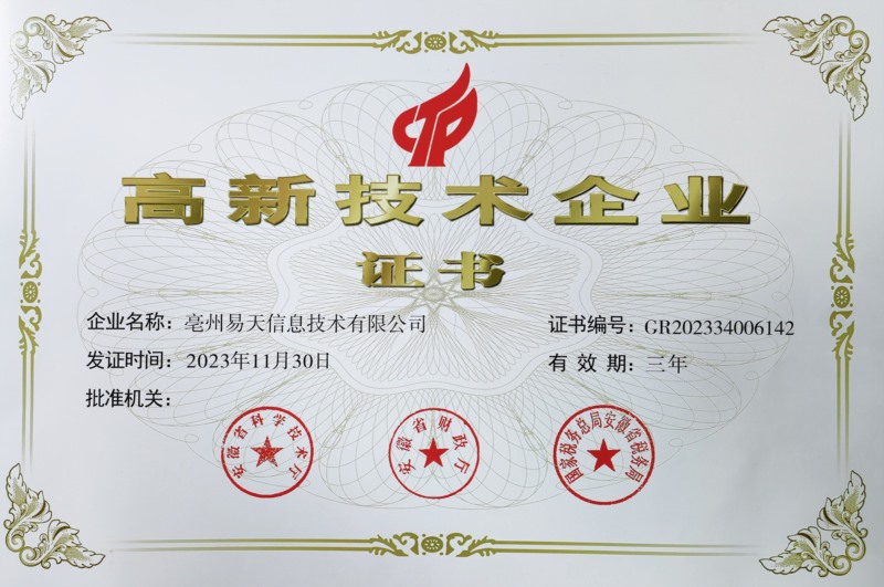 喜報(bào) 亳州易天科技榮獲《高新技術(shù)企業(yè)證書》